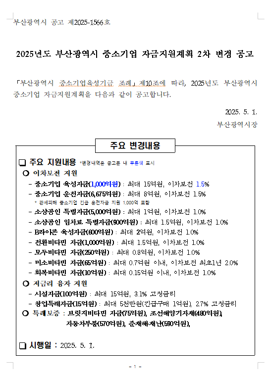 2025년도 부산광역시 중소기업 자금지원계획 공고를 게시하오니